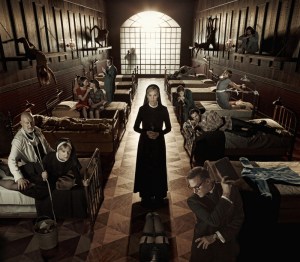 Ya dijimos también hace unos meses que la serie, en el fondo, se limitaba a usar (y abusar de) «todos los tópicos y recursos mil veces vistos ya en el género del terror», pero mezclándolo todo de forma tan desvergonzada y frenética que el resultado acababa siendo «algo parecido a una pieza novedosa y original». Optar por una casa encantada, poblada por tropecientos fantasmas, para su primera temporada no fue precisamente un alarde de originalidad, y saltar ahora en “American Horror Story: Asylum” a un oscuro hospital psiquiátrico viene a ser otra jugada un tanto obvia… Admitiendo esto, y siendo conscientes además de que la serie es lo que es y de que nunca, jamás, hay que tomársela muy en serio, ya estamos listos para poder disfrutarla a grandes sorbos y sin prejuicios. Así que este año cambiamos “La Casa del Crimen” por Briarcliff Manor, un sanatorio para enfermos mentales regentado a mediados de los 60 por un sacerdote y unas monjitas. Como para no hacerse pis o caquita encima. Y nos toca conocer a los nuevos personajes, reencontrándonos de paso con muchos rostros conocidos. Así, repiten Evan Peters, de nuevo con un rol principal, Sarah Paulson y Lily Rabe, que ganan bastante protagonismo y, aunque aún no les hemos visto en este capítulo pero lo haremos más adelante, Zachary Quinto y Frances Conroy, mientras que acaba de confirmarse el fichaje, por lo que entiendo que para bien avanzada la temporada, de Dylan McDermott. Y por supuesto, Jessica Lange. La Lange. La gran estrella de la función el año pasado, y eso que partía como secundaria, ahora está en el centro de todo el cotarro. Que esta temporada ha sido erigida en torno a ella, y que le han fabricado un personaje a su medida, la imponente Hermana Jude, es algo que damos por hecho. Tiene, ciertamente, el reto más complicado de todos, pues debe hacer olvidar a la difícilmente olvidable Constance Langdon, pero algo me dice que a esta mujer no le asustan los retos. Es más, seguro que se des-co-jo-na.